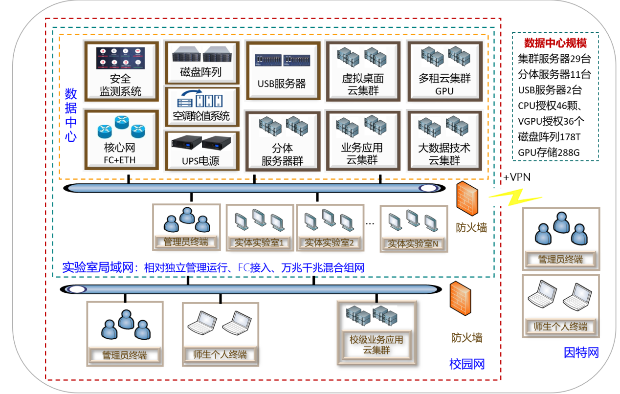 经济管理综合训练中心(省级实验教学示范中心),现有实验用房1220平方米,仪器设备总值1884万元,拥有1个私有云化数据中心和8个实验分室。数据中心基于云边协同建设了应用服务云集群、大数据云集群、算力云集群和云桌面集群,拥有数字化实验教学软资源798万元。数据中心承载虚拟仿真资源41个,专业数据分析平台4个,专业建模平台2个,BI工具4个,获得虚拟仿真一流课程国家级1门、省级2门。训练中心着力构建数字化学习空间,推动网络化泛在学习,提升学生软技能数字力,推出科学软件类、大数据技术类、专业课程类在线课程35门。