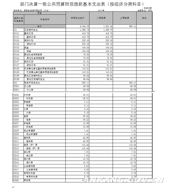 我部门2017年度决算一般公共预算财政拨款基本支出2244.55万元,其中人员经费支出1351.44万元(含工资福利支出1089.79万元、对个人和家庭的补助261.65万元),公用经费支出(商品和服务支出)893.11万元。