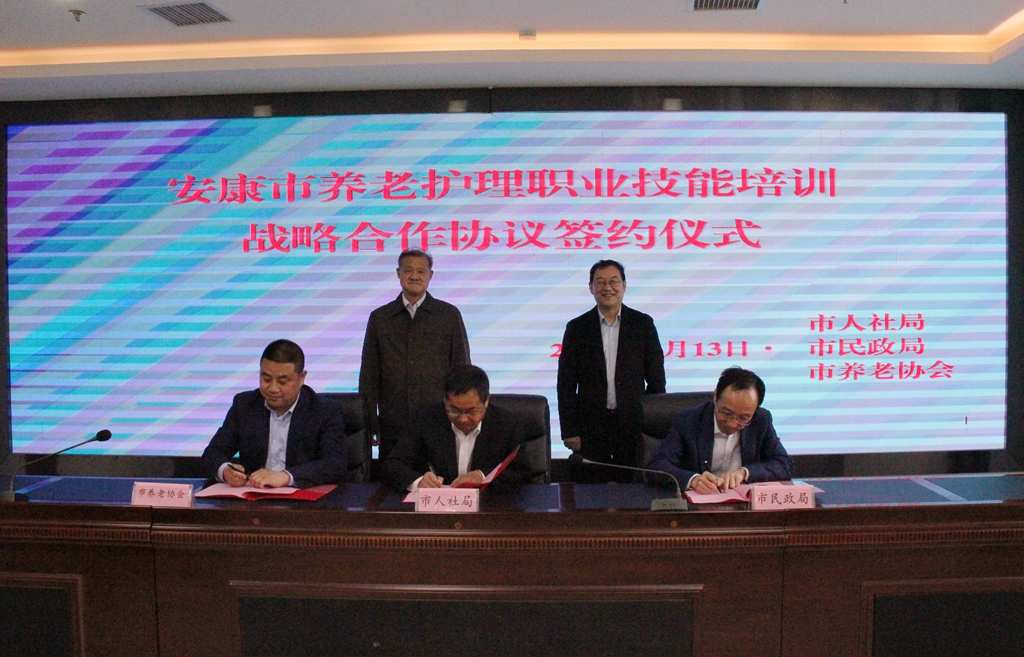 、市养老协会签订养老护理职业技能培训战略合作协议,计划用5年时间培训养老护理员1万名,全力推动我市养老服务职业技能提升,打造安康养老护理品牌,助力脱贫攻坚。