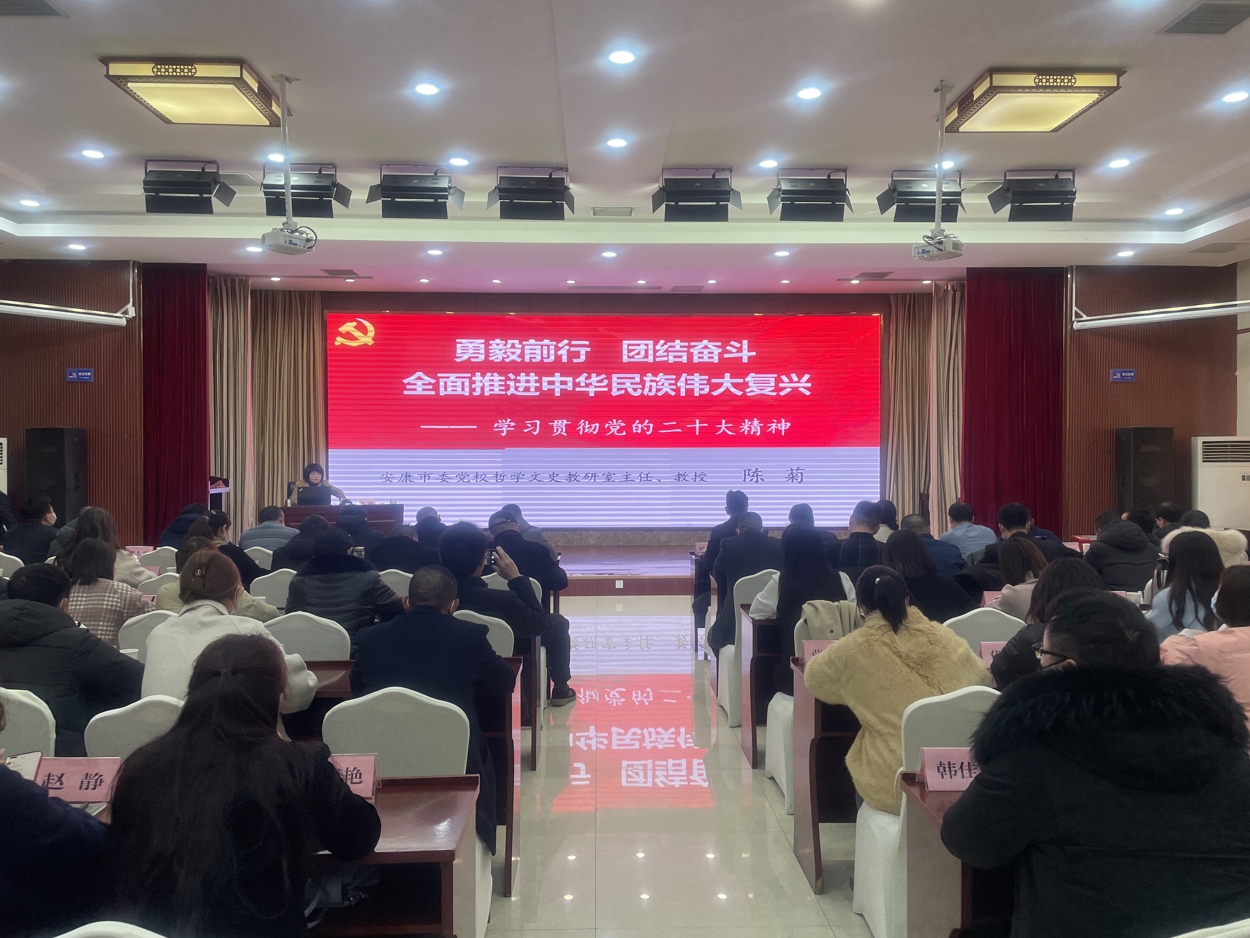 陈菊教授以“勇毅前行、团结奋斗,全面推进中华民族伟大复兴”为主题,从过去五年工作和新时代十年伟大变革的重要意义、习近平新时代中国特色社会主义思想的世界观和方法论、以中国式现代化全面推进中华民族伟大复兴、以伟大自我革命引领伟大社会革命、团结奋斗的时代要求五个方面对党的二十大报告进行了系统解读和深入阐释。