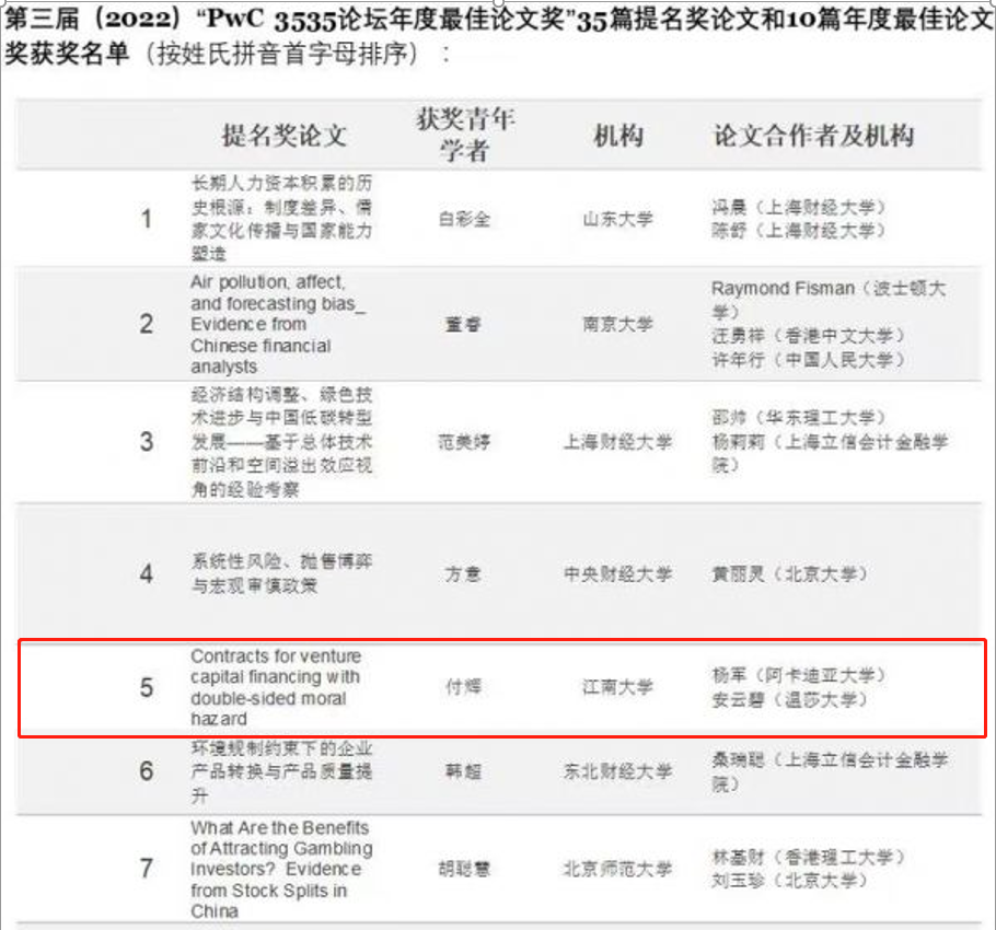 付辉副教授与合作者安云碧、杨军两位教授撰写的论文“Contracts for venture capital financing with double-sided moral hazard”(《具有双边道德风险情境的风险投资融资契约》)获PwC 3535论坛2022年度最佳论文提名奖(//www.pwccn.com/zh/3535summit.html#best-paper-award)。