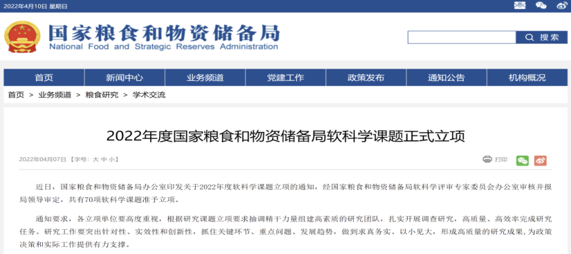 近日,国家粮食和物资储备局办公室印发关于2022年度软科学课题立项的通知,AVxxx