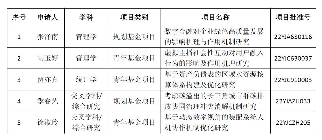 5位教师荣获2022年度教育部人文社会科学研究一般项目立项, 立项率为20.83%。