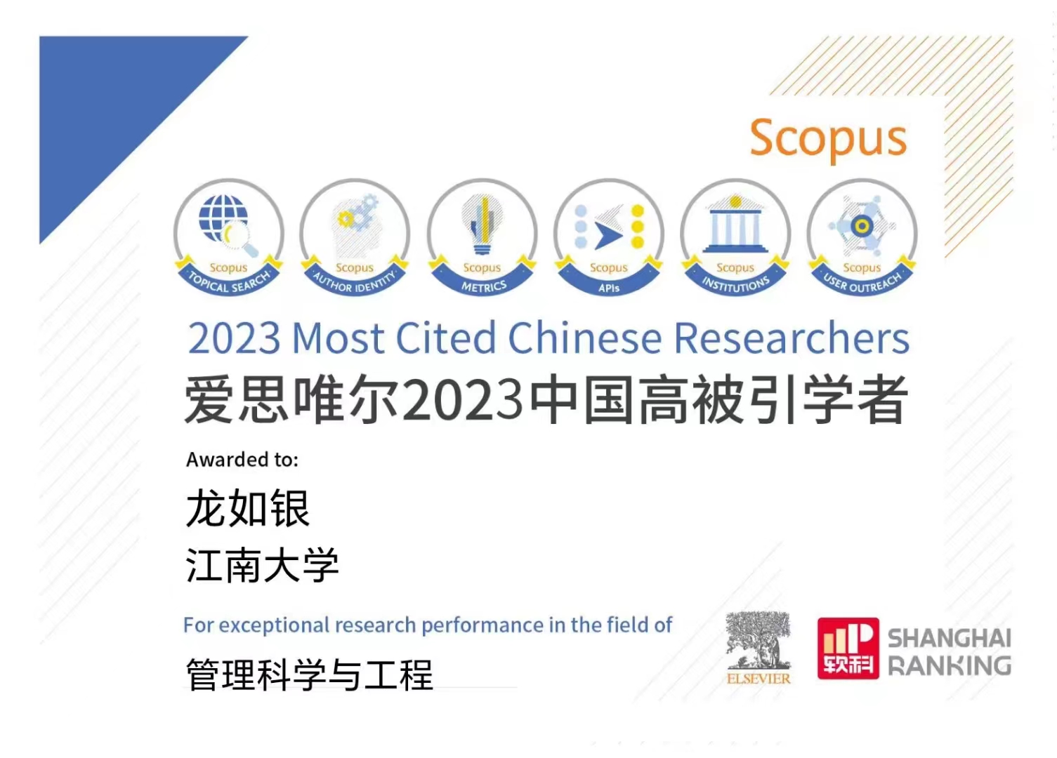 龙如银教授作为管理科学与工程学科的高被引学者入选该榜单!这也是龙如银教授继2021年入选后,连续3年入选“中国高被引学者”榜单!