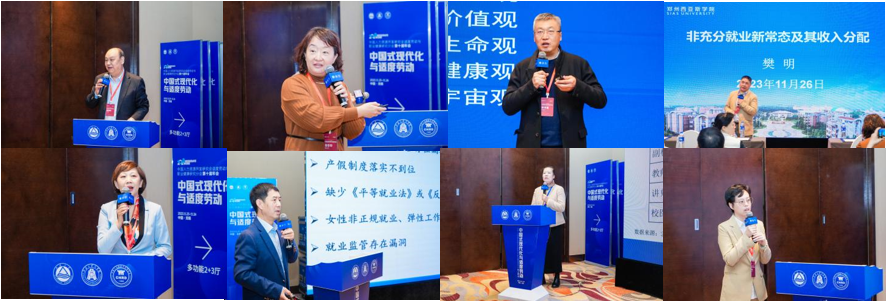 张同全教授、首都师范大学樊秀丽教授、首都经济贸易大学王欣等六位学者分别作题为“非充分就业新常态及其收入分配”、“以适度劳动促进职业健康的策略研究”、“基于不确定效应的中国过度劳动驱动机制实验研究”、“生育女性工作—家庭平衡支持政策研究”、“教师减负:日本教师工作强度与工作时间制度的改革之路”、“回望中国适度劳动问题研究二十年”的精彩报告。参会代表热情高涨、争相发言。