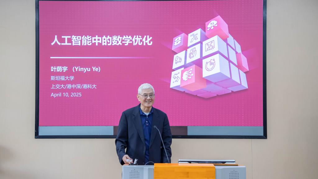 在主题报告环节,叶荫宇教授以《Mathematical Optimization in the Era of AI》为主题作报告,围绕人工智能时代的数学优化问题展开深入探讨。叶荫宇结合大语言模型的训练、调优和推理等实际应用场景,系统阐述了经典优化模型在加速和改进AI算法中的应用。他还分享了在LP与SDP求解器的突破性进展,并特别提到,这些优化技术在GPU上的高效实现,为大规模数据处理和复杂模型训练提供了强有力的支持。