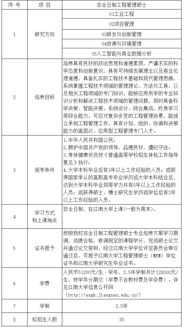 非全日制工程管理硕士(MEM)专业不招收“单独考试”考生,无“退役大学生士兵计划”和“少数民族高层次骨干人才”计划。