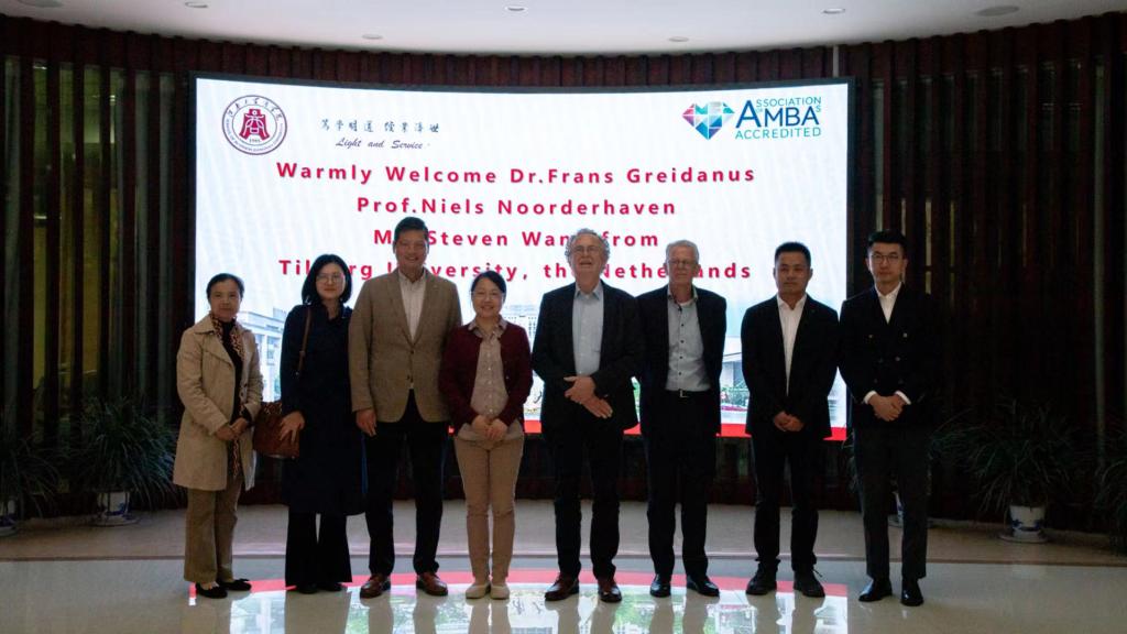 11月8日下午,荷兰蒂尔堡大学董事会顾问、浙江大学求是讲座教授Frans Greidanus博士、蒂尔堡大学经济管理学院副院长Niels Noorderhaven教授、荷兰北布拉邦省驻江苏代表王旭先生一行三人在无锡市外办欧非处一级科员龙鑫的陪同下访问AVxxx 。AVxxx 国际交流合作处副处长蔡建英、AVxxx 院长浦徐进、国际教育学院院长龚晓斌以及国际交流合作处、AVxxx 等有关人员与蒂尔堡大学代表团进行了会谈交流。