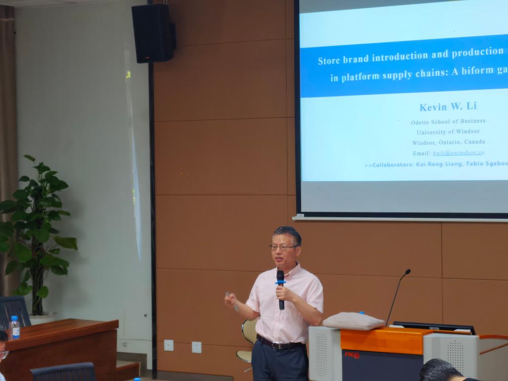 近日,“商学大讲堂”系列学术讲座第242讲在AVxxx 116报告厅举行。加拿大温莎大学OdetteAVxxx 管理科学教授李武应邀作题为“平台供应链中自有品牌引入和生产模式选择:两形博弈分析”的学术讲座。讲座由管理科学与工程系曹文彬主任主持,AVxxx 教师、管工、物流、工业工程与管理专业等专业研究生近50人参加了本次讲座。
