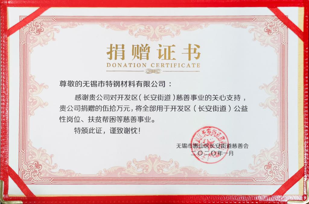 德新钢管(中国)有限公司向无锡市惠山区长安街道慈善会捐赠50万元