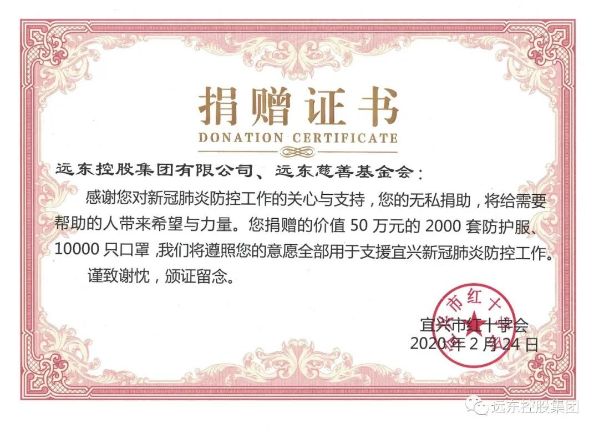 1.2020年2月24日上午,远东控股集团&远东慈善基金会抗击疫情捐赠仪式圆满举行。宜兴市副市长储红飙,市红十字会会长李莉,投资人、远东控股集团高级顾问、远东慈善基金会理事长陈晓芬,投资人、集团资深顾问、远东慈善基金会执行理事长周东佼出席捐赠仪式。