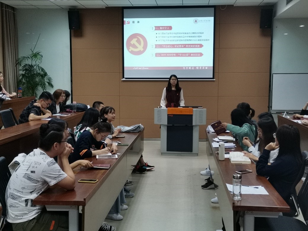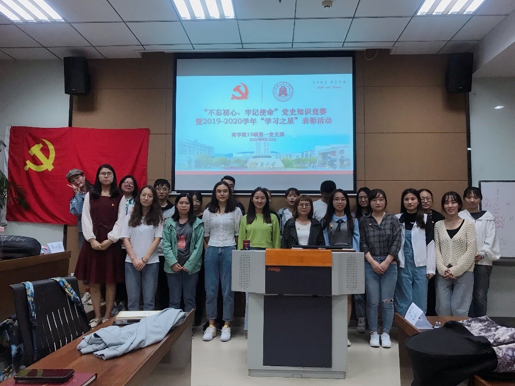 接着,党支部开展“不忘初心、牢记使命”党史知识竞赛活动。党史知识竞赛共分为必答题、自答抢答题、自选抢答题3个环节,支部党员及入党积极分子按既定分组就坐,每一位党员同志均参与其中。竞赛结束后,最终决出优胜组及其他组的“组内优胜者”。此次活动一改以往党课形式,形式新颖,内容丰富,对支部内党员同志的理论知识学习起到了很好的助推作用,并加强了支部内同志的交流与互动,活动的开展总体而言取得了理想的效果。陈雪雯同志表示,在参与党史知识竞赛的过程中,看到了支部同学扎实的理论知识,更加激发自身理论知识学习的积极性,进一步履行党员义务,发挥党员的先进模范作用。