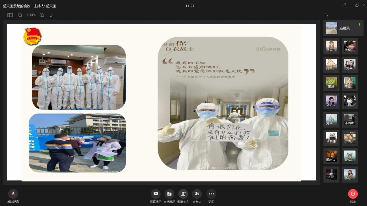 国贸1802班团支部通过此次团课,致敬活跃在战疫一线的志愿者们,他们身上就闪耀着雷锋精神的光芒,他们的感人事迹就是雷锋精神在新时代的生动体现。无数个“雷锋”们缓解了各地疫情防控一线人手不足、力量薄弱的难题,传递出温暖与力量,给人们以勇气与希望,为统筹推进疫情防控和经济社会发展工作贡献出强大的力量。