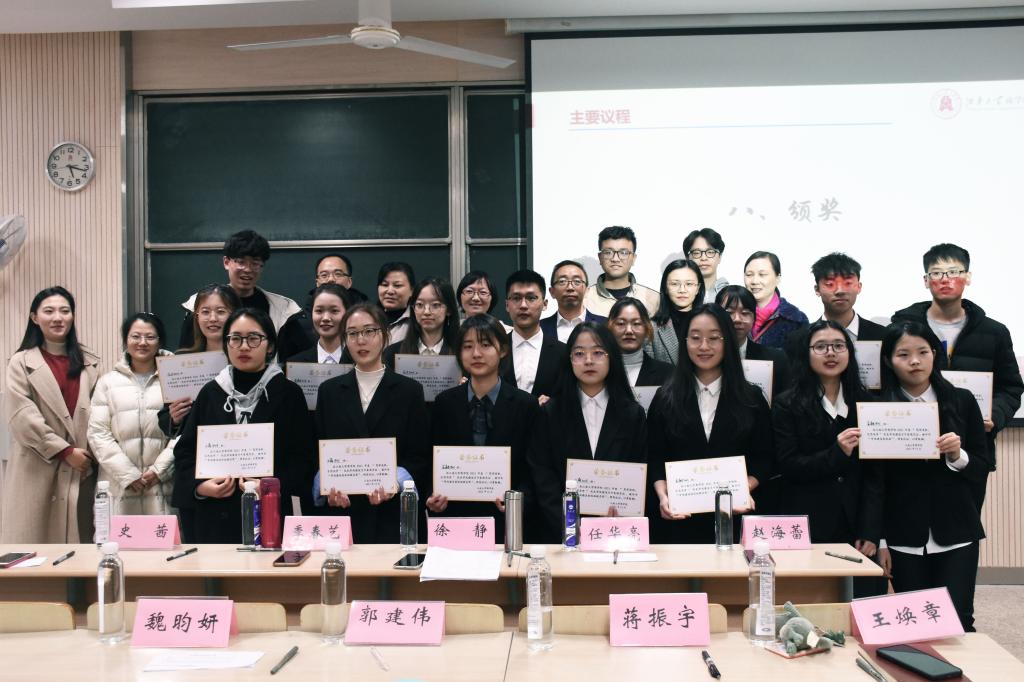 各班级学风创建成果展示结束后,学院领导进行了总结发言。院党委副书记兼副院长徐静宣读本次评比结果并为获奖班级颁发荣誉证书。本次活动共评选出会计1801、金融1803、会计1902、会计1903、国贸1902、金融1901、会计2002、会计2003、国贸2001、金融2003十个 “学风建设创优班”。此外,工商1804、工商1901、金融1902、工商2003和金融2001荣获“学风建设创优班提名奖”。获奖班级虽各具特色、各有风采,但又都具备分工明晰又团结一致的班级建设、积极奋进又脚踏实地的学风建设、立意深远的党团建设以及丰富多彩的文体活动,以实际行动弘扬了“笃学明道,经业济世”的院训精神。纵观本次评比,师生们共同领略了16个班级的精彩展示,这既是优秀学风班级评比答辩,也是各班展示成果和互相交流的平台。愿各班继续秉持“奋斗没有终点,成功自己实践”的理念,发扬“奋斗进取,开拓创新”的精神,将各班集体的建设计划落到实处,在下一学年更上新的台阶!