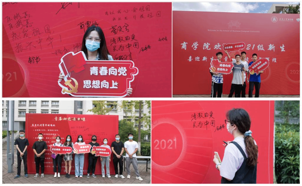 以“青春心向党”为迎新主题,在学院广场上设置了“青春向党”告白墙,将思想引领融入到迎新之中,号召新生听党话、跟党走,教育引导新生树立“强国有我,请党放心”的坚定信念。前来报到的新生们纷纷在告白墙上写下对百年大党的真挚祝福与自己的青春誓言。来自工商管理2101班的本科生王欣迪同学郑重的在告白墙上写下“强国一代有我在”的承诺。来自21级应用经济学专业的刘芊芊写下“清澈的爱,只为中国”表达对祖国的热爱。