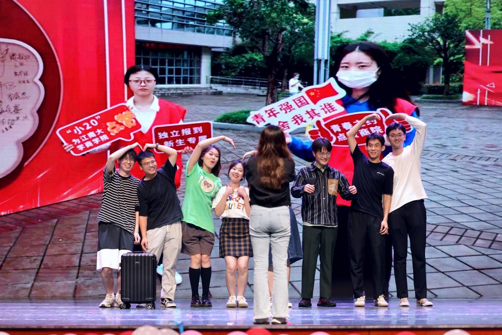第一篇章“相逢未有期”中,晚会序幕由校艺术团舞蹈部同学带来的舞蹈《Drama》拉开,激情四射的音乐,铿锵有力的舞动,尽展青春风采,点燃晚会全场。青春中,少年难免会迷茫,但永远不会失去尝试的勇气。毕业生王奕昕同学和史果同学为大家献上了一首《迷途的孤鸟》,祝愿全体毕业生冲破迷障,找到属于自己的光芒。既有前程可奔赴,亦有岁月可回首。大数据2023级同学们为大家带来了配音秀《美人鱼之我入学江大了》,生动诙谐的表演,将我们再次拉回了那个青涩懵懂的夏天。
