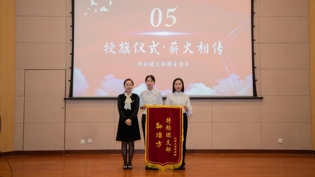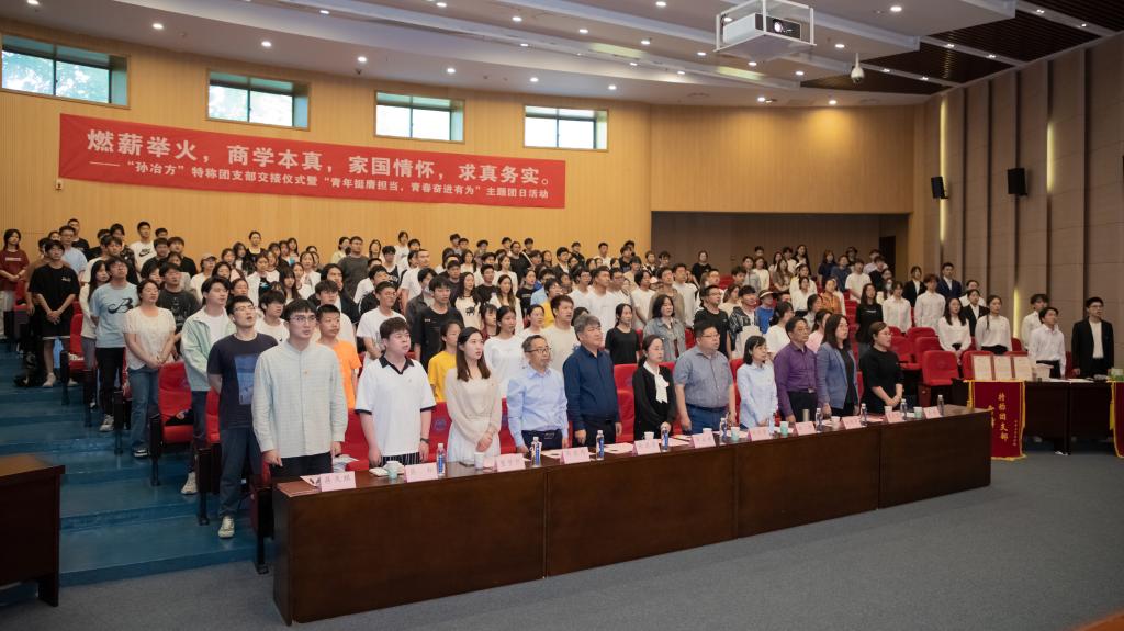 授旗仪式,薪火相传。校团委副书记单云婷为“孙冶方”、“雷锋”特称团支部接任班级授旗。孙冶方基金会理事、校外指导员张建清以“书”为媒,向团支部代表赠书,传达对青年学子的深切希望。