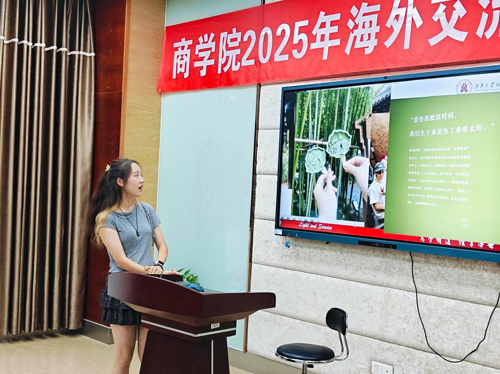 工商国际2401班的许燕妮同学以“开盲盒”为主线,从“知识”“文化”“视野”三个维度分享了参与2025年“锦绣江苏”国际暑期学校的经历。无论是走出课堂深入企业的商战实践,还是与外国友人共探文化魅力的互动体验,都为她揭开了最重要的“视野盲盒”。她感慨道:“这段经历赠予我们的,是一个更广阔的世界,以及未来无限的可能性。”