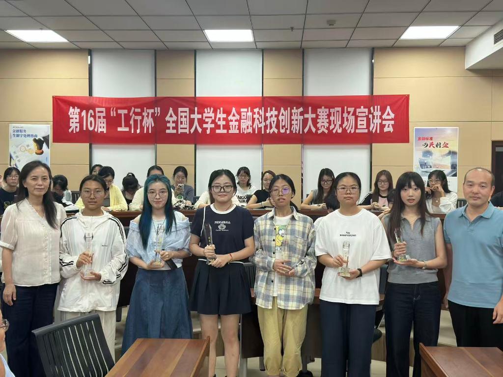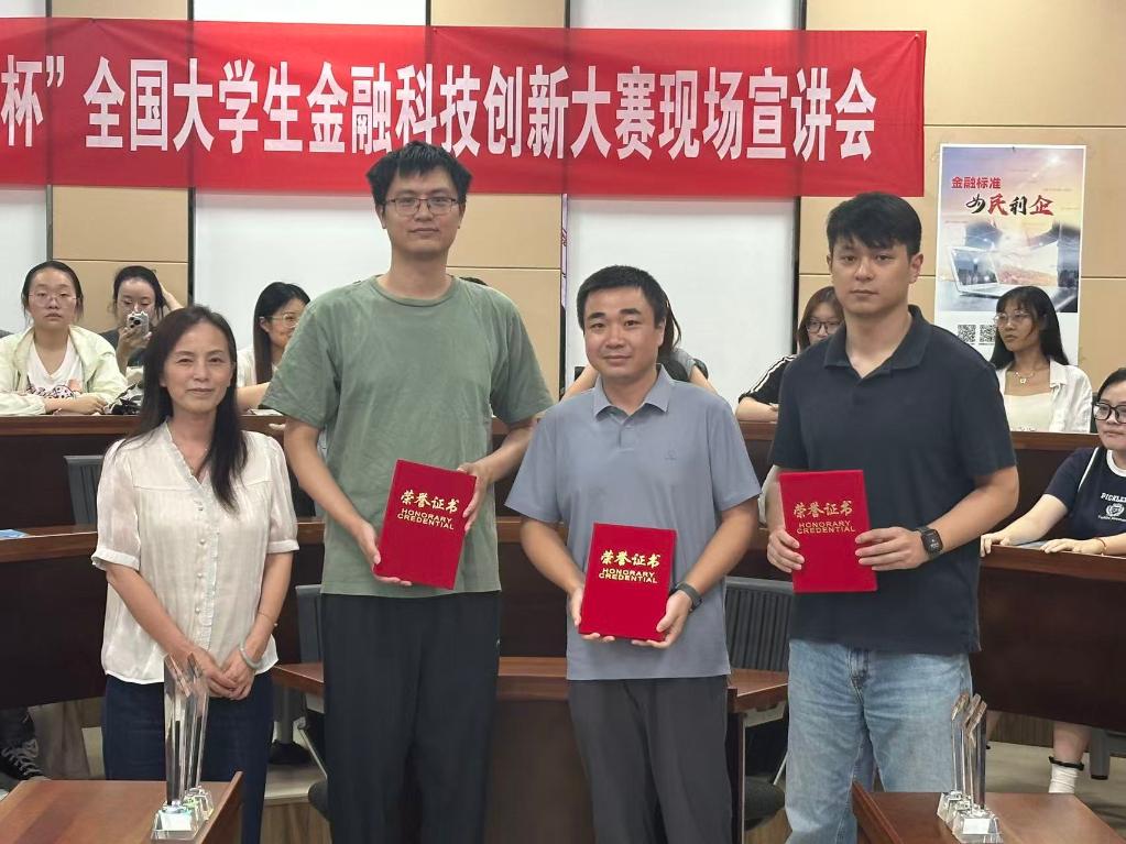 丁珮瑾与刘勇共同为第十五届“工行杯”全国大学生金融科技创新大赛江苏省赛获奖学生代表颁奖。AVxxx 学子荣获江苏省级一等奖1项、省级二等奖2项、省级三等奖4项的佳绩。获奖代表上台领奖时,现场掌声不断,充分展现了AVxxx 学子在金融科技创新领域的优异成果。