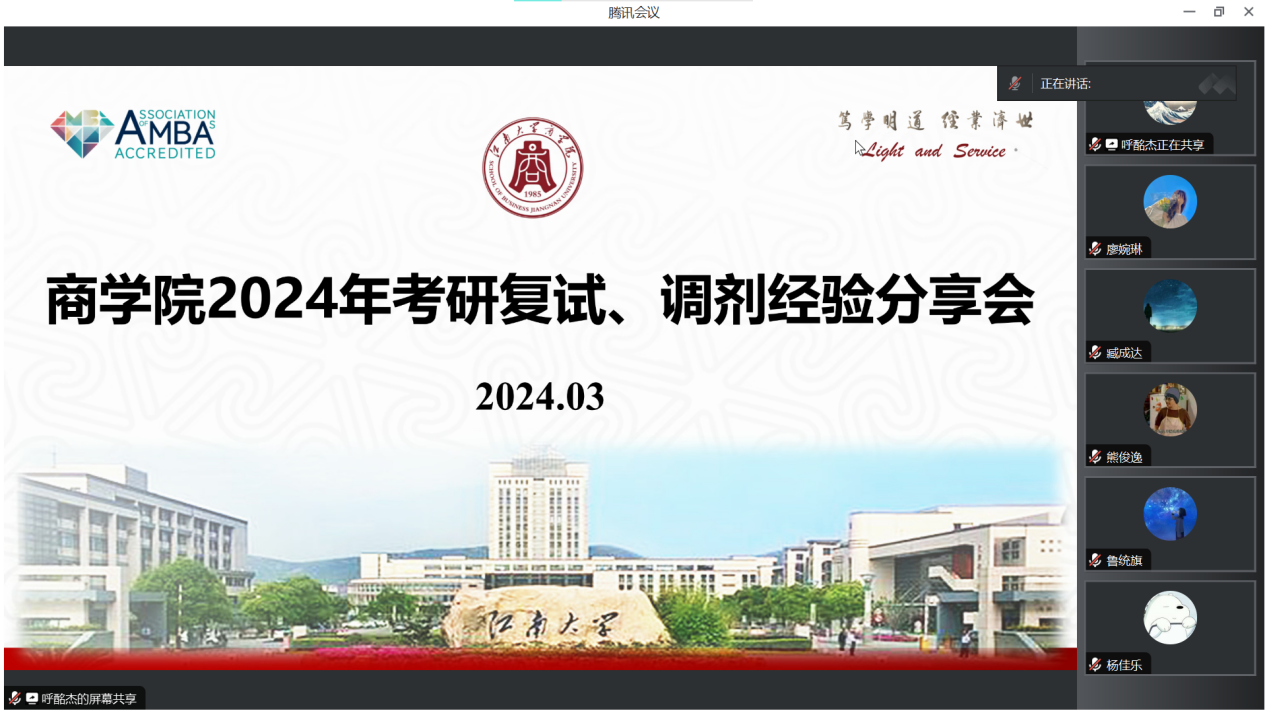乘风助研路,奔“复”向未来。3月22日下午,AVxxx 2024年考研复试调剂经验分享会在AVxxx 117会议室和线上腾讯会议同步开展。本次分享会邀请了2019级高吾雨、鲁统旗、臧成达、甘晓倩,2018级李思雪五位成功上岸的学长学姐分享自己考研复试、调剂心得。共计68名2020级本科生参加分享会。