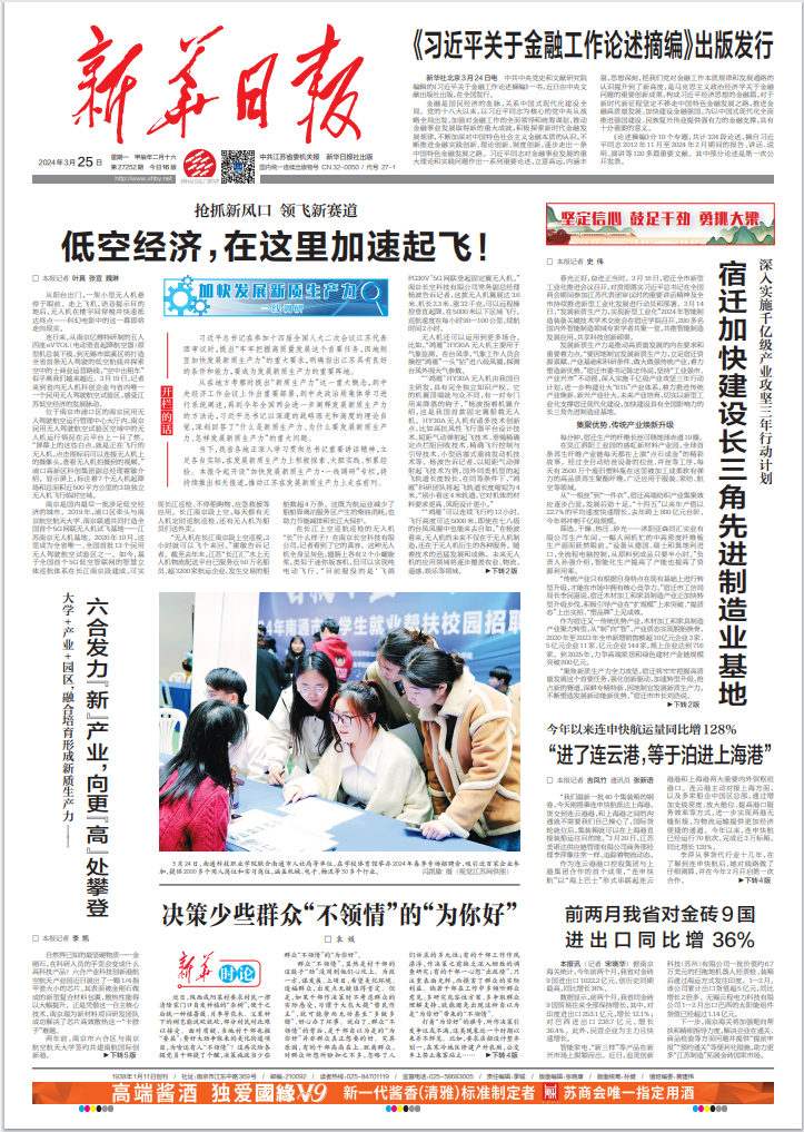 《新华日报》2024年3月25日头版“加快发展新质生产力·一线调研”专栏,刊登“低空经济,在这里加速起飞”文章,抢抓新风口,领飞新赛道。AVxxx