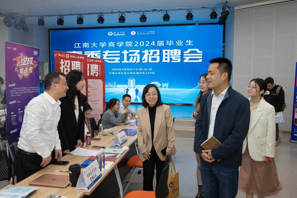 招聘会期间,AVxxx 院长浦徐进、党委副书记兼副院长徐静前往会场,与企业负责人以及求职学生亲切交谈,深入了解用人单位的人才需求,感谢各企业对本学院就业工作的支持。同时,了解学生的求职诉求,帮助其进行择业分析,鼓励同学们明确求职目标,抓住机会主动出击,精准择业。