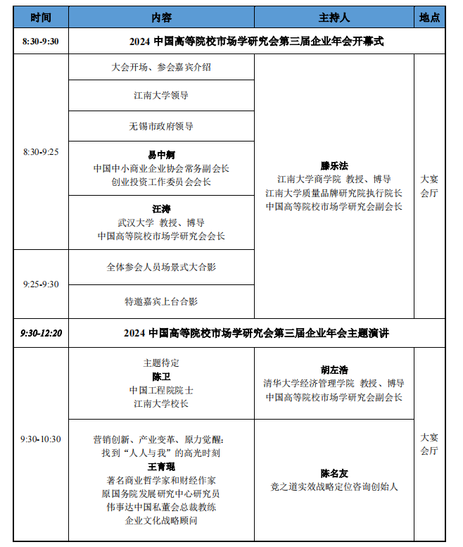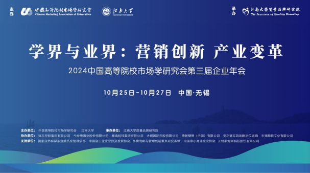 质量品牌研究院承办的第三届企业年会。本届企业年会将于 2024 年 10 月 25-27 日在享有“中国民族工商业发祥地”美誉的无锡召开。中国高等院校市场学研究会是国家一级学会,是主要由全国各高等院校从事市场营销学教学和研究的专家学者组成的非营利性学术团体。由中国高等院校市场学研究会主办的企业年会是学术界与企业界重要的交流平台,被誉为“中国营销界的产学顶级峰会”。