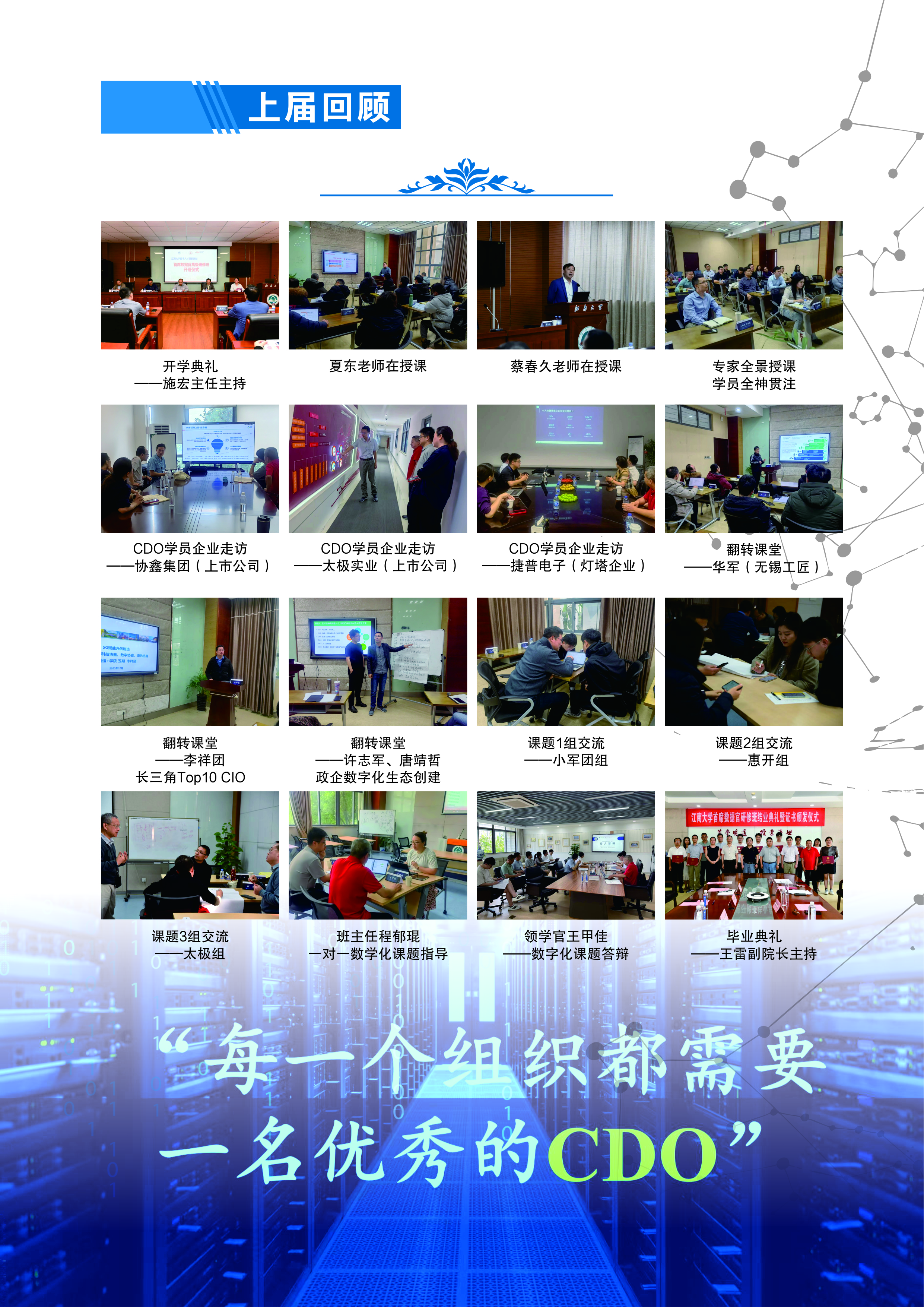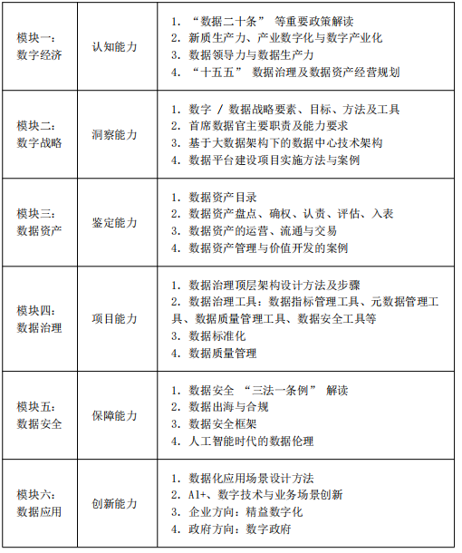 主要涉及数据治理、数据管理、业务创新等方面的具体工作方法;通过集体研讨、类工作坊的方法等互动性强、实践导向的课程。