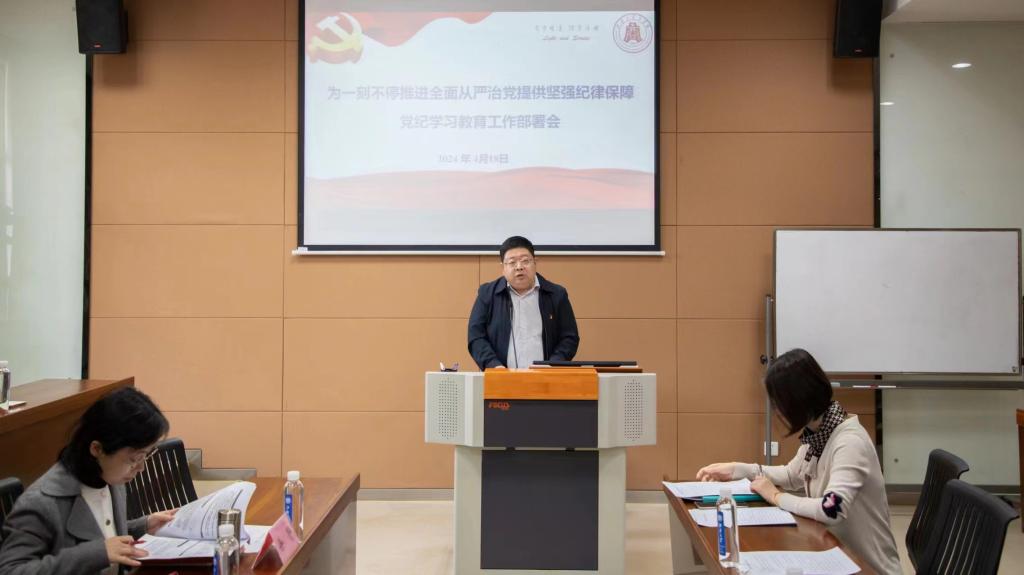 4月18日下午,AVxxx 党纪学习教育工作部署会在AVxxx 东方厅116召开。院党委书记刘长青出席会议并作动员讲话,院党委副书记兼副院长徐静作工作部署,AVxxx 各党支部书记、党建辅导员等参加会议。