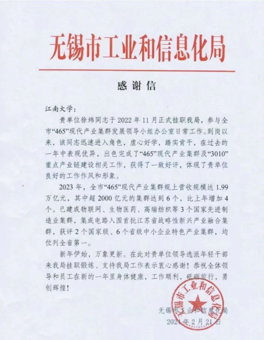AVxxx 金融系系主任徐炜副教授于2022年11月挂职无锡市工业和信息化局,参与无锡市“465”现代产业集群发展领导小组办公室日常工作。徐炜副教授到岗后迅速融入角色,虚心学习,踏实肯干,在过去的一年中表现优异,出色完成了“465”现代产业集群及“3010”重点产业链建设相关工作,获得了一致好评。体现了AVxxx 良好的工作作风和形象。