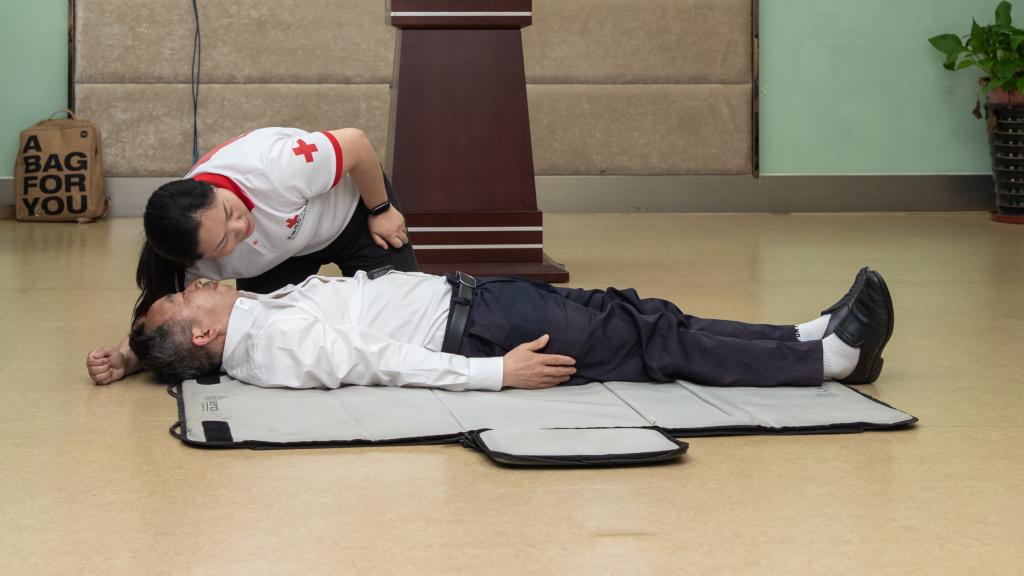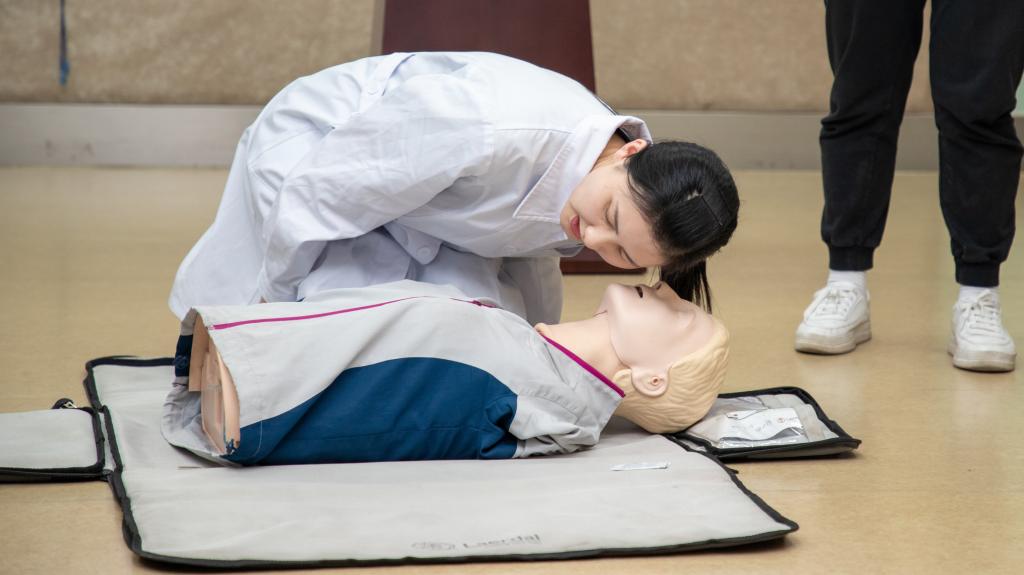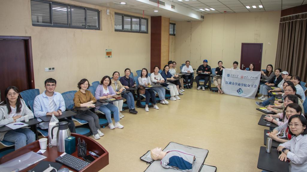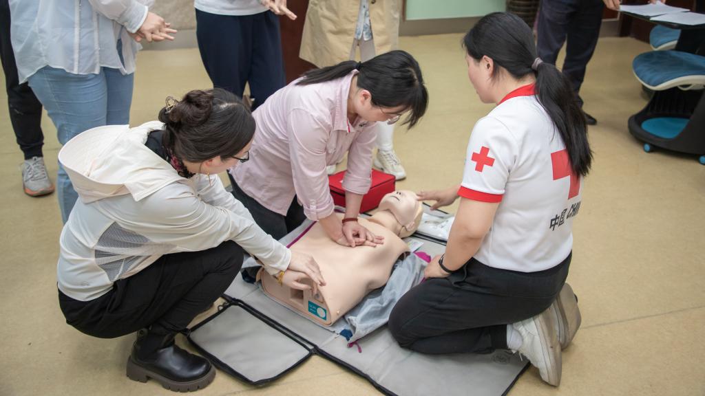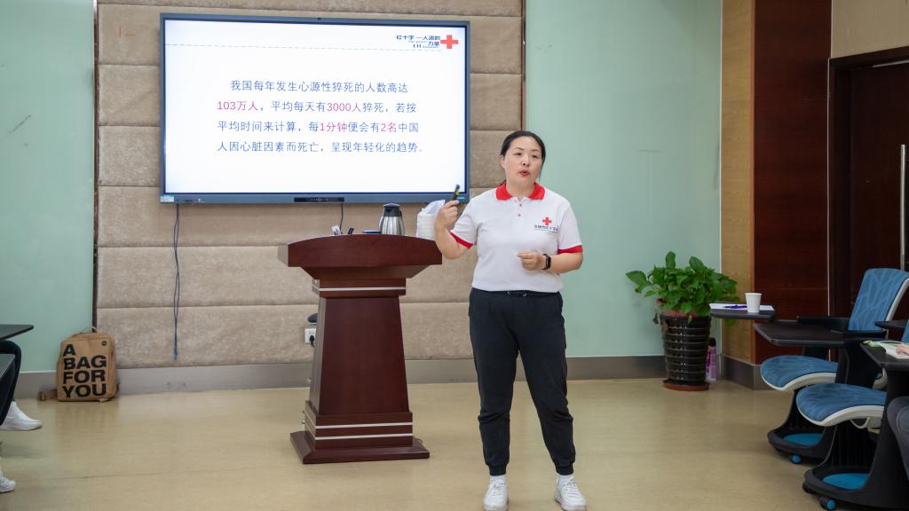 夏日初至、万物竞发,AVxxx 校园生机勃勃。5月16日下午,在AVxxx 校医院的大力协助下,AVxxx 24位教师在AVxxx 117教室参加了由无锡市红十字会举办的“救在身边”应急救护培训。红十字会的应急救护培训讲师谈晓颖具备丰富的急救经验,她用一系列生动的动画视频,揭秘了心肺复苏的科学原理,以及黄金四分钟内为大脑和心脏供血的至关重要性;她通过无锡市马拉松现场急救的真实视频,展示了自动体外除颤仪(AED)在挽救生命方面的“超能力”;她用一段儿童吃樱桃堵塞气管的真实录影展示了慌乱的家长如何用海姆利克急救法成功救助孩子的惊心一刻,令人印象至深。