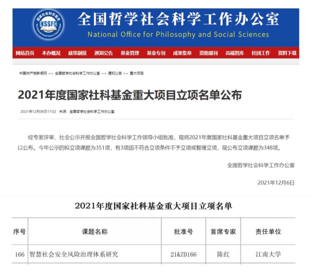 国家安全与绿色发展研究院院长陈红教授作为首席专家申报的“智慧社会安全风险治理体系研究”获得立项,项目批准号(21&ZD166)。这是陈红教授主持的第2个国家社会科学基金重大项目。