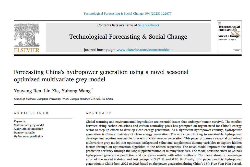 王育红教授团队在创新管理领域重要期刊《Technological Forecasting & Social Change》发表题为“Forecasting China's hydropower generation using a novel seasonal optimized multivariate grey model”的研究论文。