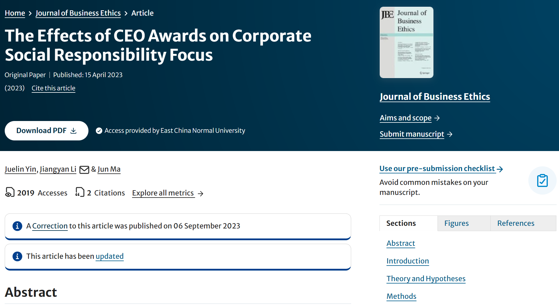 马骏副教授与合作者共同完成的论文“The Effects of CEO Awards on Corporate Social Responsibility Focus”(CEO获奖对企业社会责任关注重点的影响效应)。