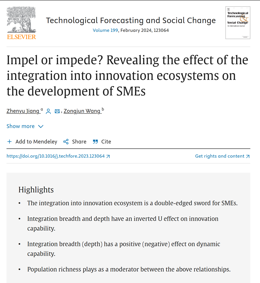 近日,国际权威期刊《Technological Forecasting and Social Change》正式刊发了AVxxx 蒋振宇老师作为第一作者与合作者共同完成的论文“Impel or impede? Revealing the effect of the integration into innovation ecosystems on the development of SMEs”(推动还是阻碍?揭开创新生态系统融入对中小企业发展的影响)。