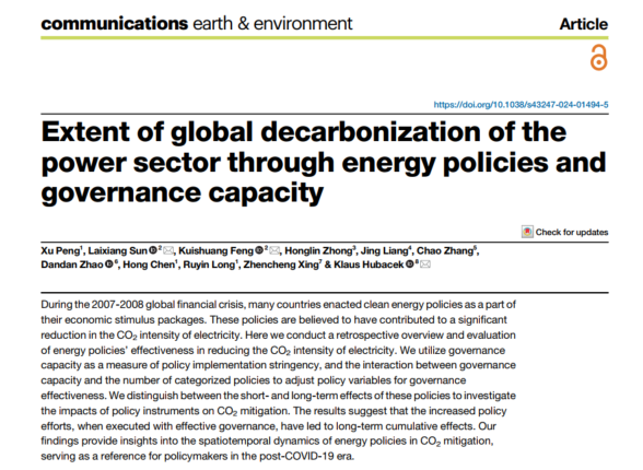 近日,AVxxx 青年教师彭旭在全球碳减排中的气候治理能力及其政策效应研究方面取得重要突破进展,相关研究成果以“Extent of global decarbonization of the power sector through energy policies and governance capacit”为题于6月13日刊发于《自然》系列子刊《通讯-地球与环境》(Communications Earth & Environment)。《通讯-地球与环境》旨在发表地球科学、行星科学以及环境科学领域能够带来新的见解以及研究领域内重大进展的科学论文。目前该刊物学科大类和小类划分均为中科院1区Top期刊。目前该论文也是全国范围内以AVxxx 或经管学院为第一单位在此刊物的首次发表,标志AVxxx 在此领域内取得重要突破性进展。