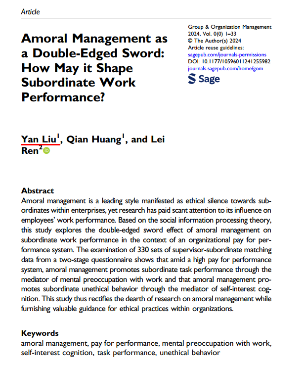 刘燕教授与研究生黄倩以及无锡学院任磊合作的论文“Amoral Management as a Double-Edged Sword: How May it Shape Subordinate Work Performance?”在管理学领域期刊《Group&Organization Management》正式刊出。《Group&Organization Management》是SSCI检索期刊,影响因子4.0,中科院二区,ABS三星级期刊。
