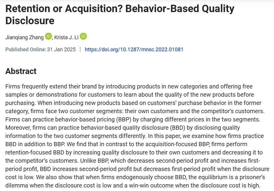 张建强教授作为第一作者与印第安纳大学Krista Li教授合作的论文“Retention or Acquisition? Behavior-Based Quality Disclosure”在国际运筹学与管理科学领域顶级期刊《Management Science》在线发表,实现了AVxxx