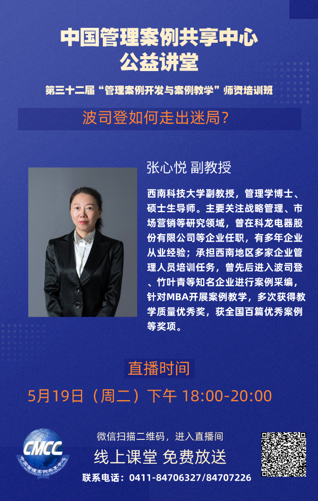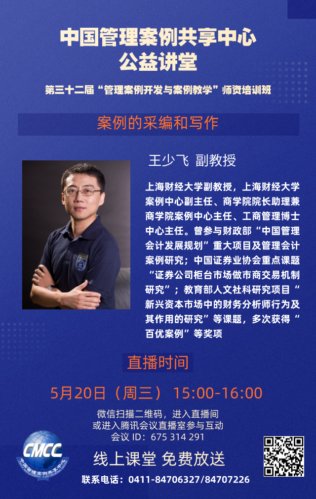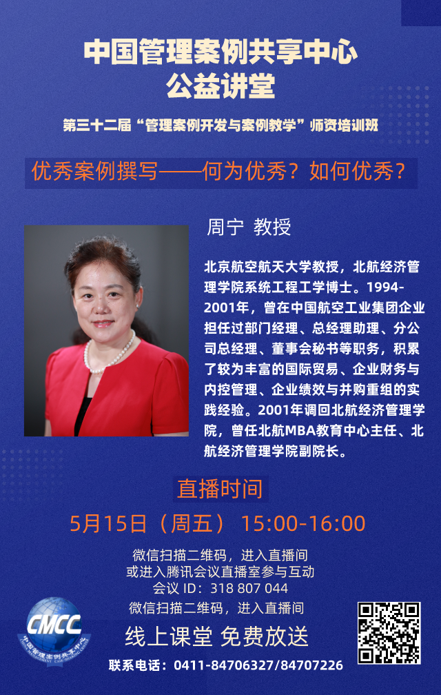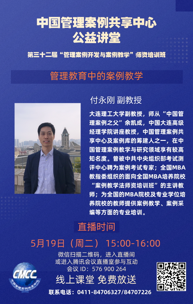 为进一步提升各MBA培养院校教师案例开发的兴趣与能力,提高教师广泛参与案例开发与教学的积极性和水平,由全国工商管理专业学位研究生教育指导委员会、中国管理案例共享中心主办的第三十二届中国管理案例共享中心“管理案例开发与案例教学”师资培训班将于2020年5月12--20日举办。本届培训班将邀请六位在案例教学与采编方面经验丰富、成就卓越的专家学者在线进行主题报告及课堂观摩,并答疑解惑。