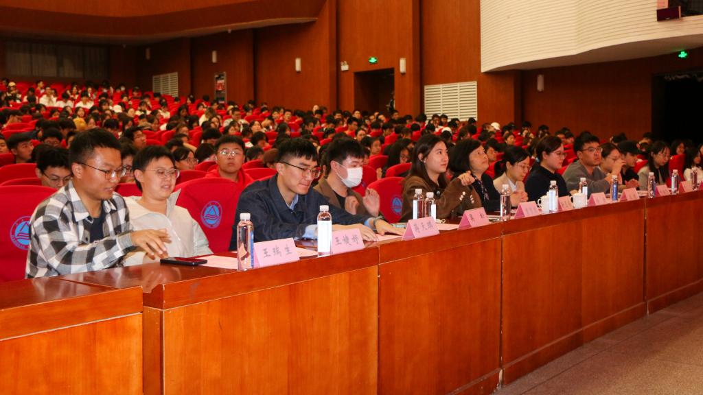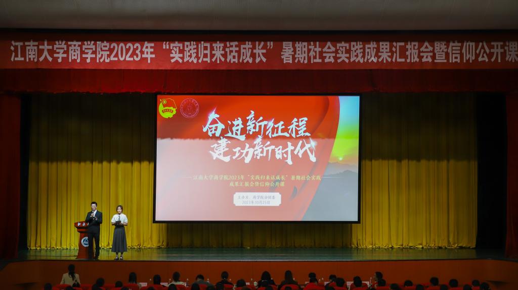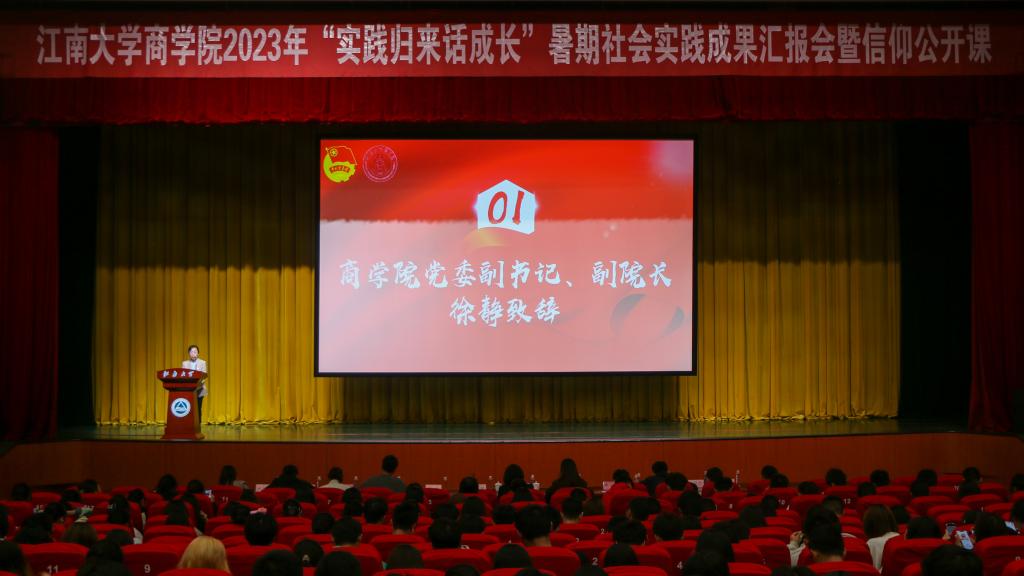 2023年暑期社会实践成果汇报暨信仰公开课于10月25日晚在文浩馆观众厅成功举办,院党委副书记兼副院长徐静、优秀实践指导老师谢玉梅、分团委书记王璁及全体辅导员出席,2023级全体新生及2022级班团骨干参与活动。