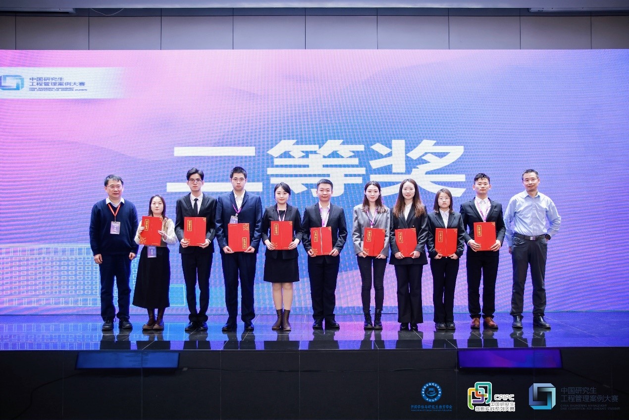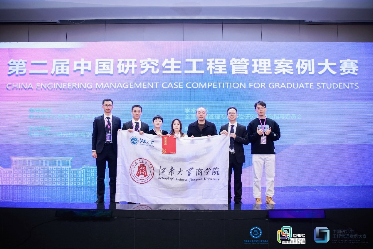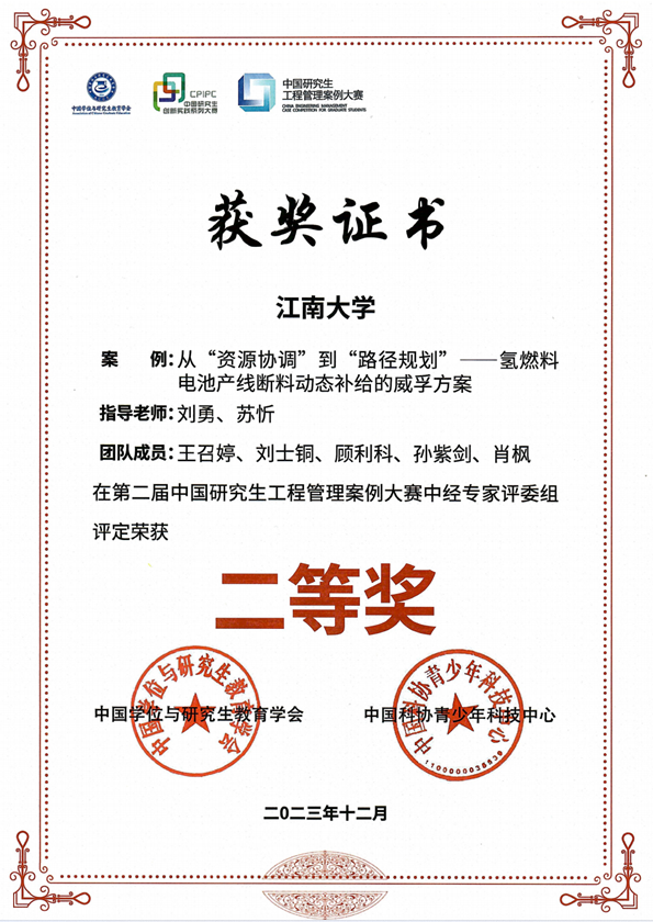 “江南顶梁柱”团队(指导老师:刘勇、苏忻 团队成员:王召婷、刘士铜、顾利科、孙紫剑、肖枫)合作撰写的案例——《从“资源协调”到“路径规划”——氢燃料电池产线断料动态补给的威孚方案》,从全国 133 家研究生培养单位提交的270 个有效案例中脱颖而出,以总得分第四名荣获全国总决赛二等奖。