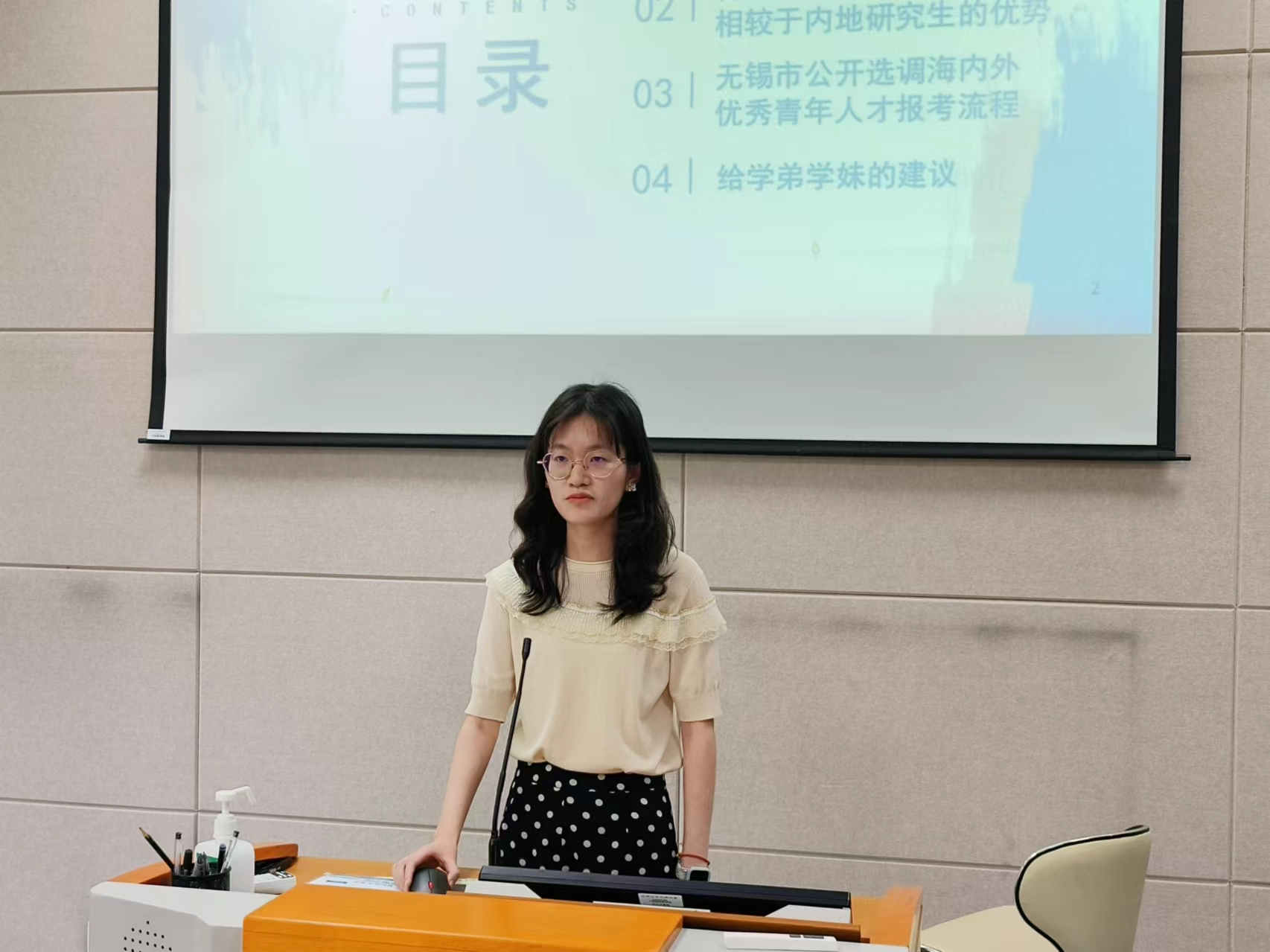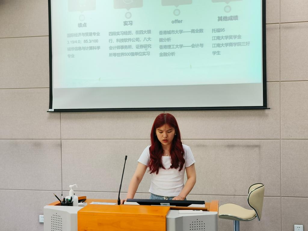 随后,2018级校友、升学至香港中文大学、上岸无锡市海内外选调生的张颖菲首先分享了在香港中文大学的求学经历,她对比分析国内研究生与境外研究生学习的培养方案、专业课程、实习实践环节以及毕业要求等要素,又分享了无锡市海内外选调生的备考经验;2020级会计学、升学至伦敦国王学院的张景悦分享了自己在爱丁堡大学的交换经历,她在交换期间以优异的成绩荣获江苏省政府境外学生奖学金,她建议学弟学妹们提早规划自己的海外升学之路,除了语言成绩要过关外,高质量的实习、游学交换也是成功申请名校offer的关键;2020级国际经济与贸易、升学至香港理工大学的段合佳主要和同学们分享了申请香港学校的基本条件、绩点要求和备考托福的情况,梳理了海外升学申请的时间节点,她建议学弟学妹们大一大二认真学习专业知识,努力提高绩点均分,争取取得心动的offer。