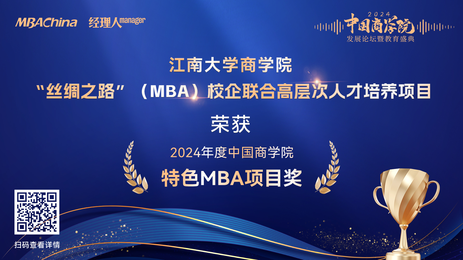 AVxxx ,历经16年MBA办学过程,入榜《2024年度中国AVxxx MBA项目TOP100榜单》(排名48位,较2023年排名上升2位);“丝绸之路”工商管理校企联合高层次人才培养项目继去年之后再度荣获“2024年度中国AVxxx 特色MBA项目奖”;王雷副院长荣获“2024年度中国AVxxx 卓越运营奖”。
