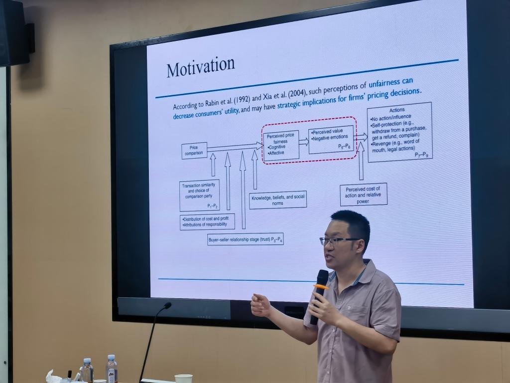 曹庆宁副教授以“Product Bundling and Distributional Fairness”为主题进行分享,详细解释了消费者因产品或服务价格不公平产生负面反应进而影响自身效用及企业定价决策现象的内在逻辑。此外,他也对生成式AI工具在科研与教学的应用经验进行了分享。他表示,通过与AI进行对话以及搭建个人AI模型,可以更轻松地找到研究相关案例和数据,为科研工作节省时间。