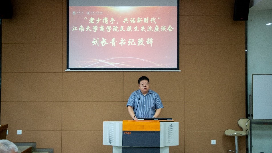 党委书记刘长青致开场辞,他指出党和国家高度重视民族团结工作,习近平总书记强调要引导各族人民牢固树立休戚与共、荣辱与共、生死与共、命运与共的共同体理念。刘书记回顾了2018年以来无锡市军休中心与校关工委联合开展的“民族一家亲、关爱育新人”民族学生捐资助学活动,向军休中心的老领导们对于学校人才培养工作的关心和支持致以崇高的敬意。刘书记指出,本次座谈会以“老少携手,共话新时代”为题,希望以军休中心老同志、AVxxx