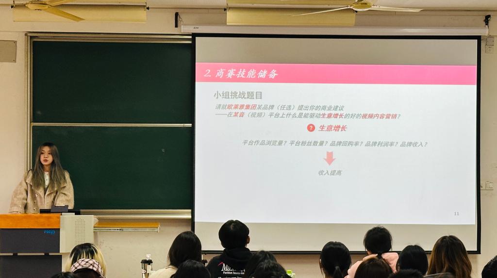 曾致纯同学结合自身丰富的经历,通过一道商赛小组挑战题目的讲解来引出话题,让同学们对商赛的流程以及其所要具备的技能有了一定的了解。她以大一同学对赛事的选择及证书获取为出发点,从实训的实际运用、商赛技能储备、面试加分经历等多方面对同学们进行了专业上的指导,提出了学习ACCA的优势及作用,强调了切实合理地选择的重要性,鼓励同学们多方向发展自己,充实大学生活。