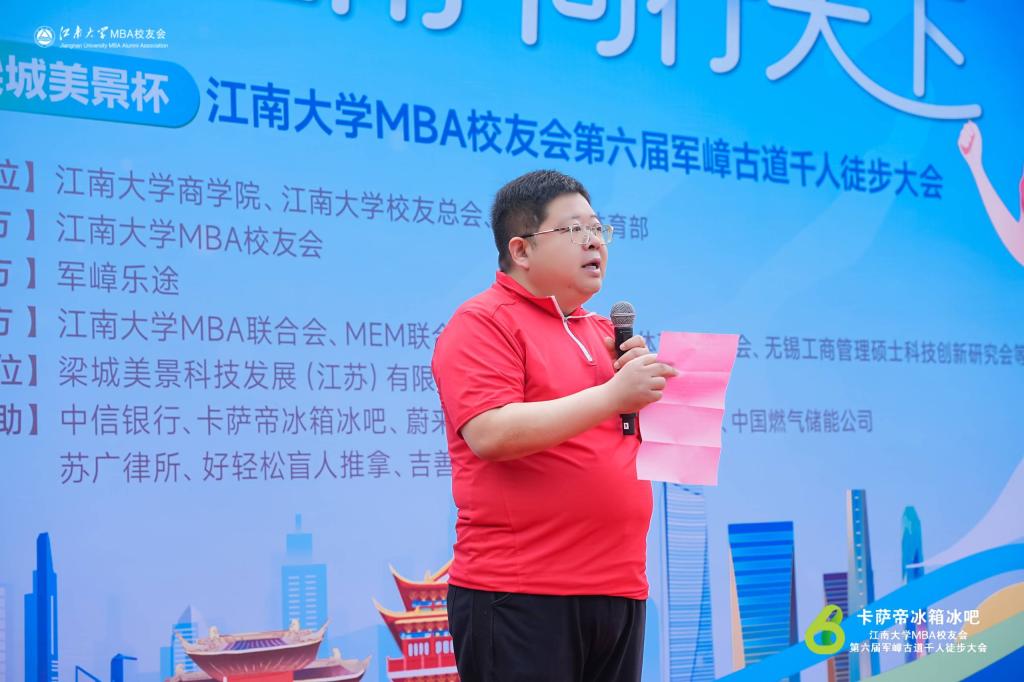 党委书记刘长青致辞,刘书记表示在新中国成立75周年和奥运年举行徒步大会意义非凡,希望队员们在活动中以勇往直前、奋发向上、顽强拼搏的意志品质精神,在徒步锻炼中享受乐趣、增强体质、健全人格、锤炼品性。冠名赞助商梁城美景科技发展(江苏)有限公司品牌营销部崔鹏经理、连续两年支持活动的赞助商代表中信银行无锡分行副行长蔡映霞女士分别登台致辞。