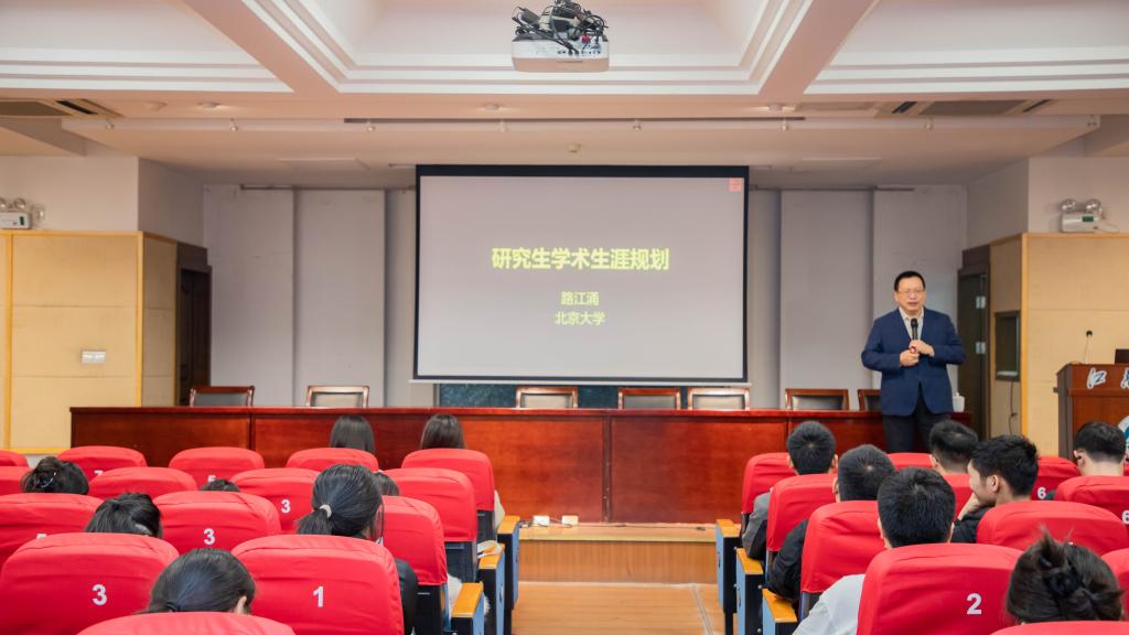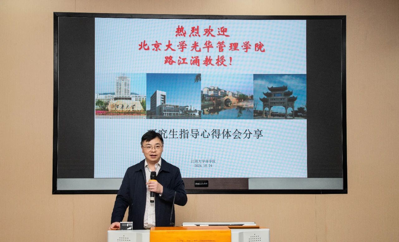 举办“研途导航,智启未来”导师培训暨2024级新⽣转型教育专题讲座。活动特邀北京⼤学光华管理学院组织与战略管理系教授、北京⼤学博雅特聘教授路江涌担任主讲嘉宾,学院研究⽣导师及⻘年教师、2024级全体硕博研究⽣参会,会议由AVxxx