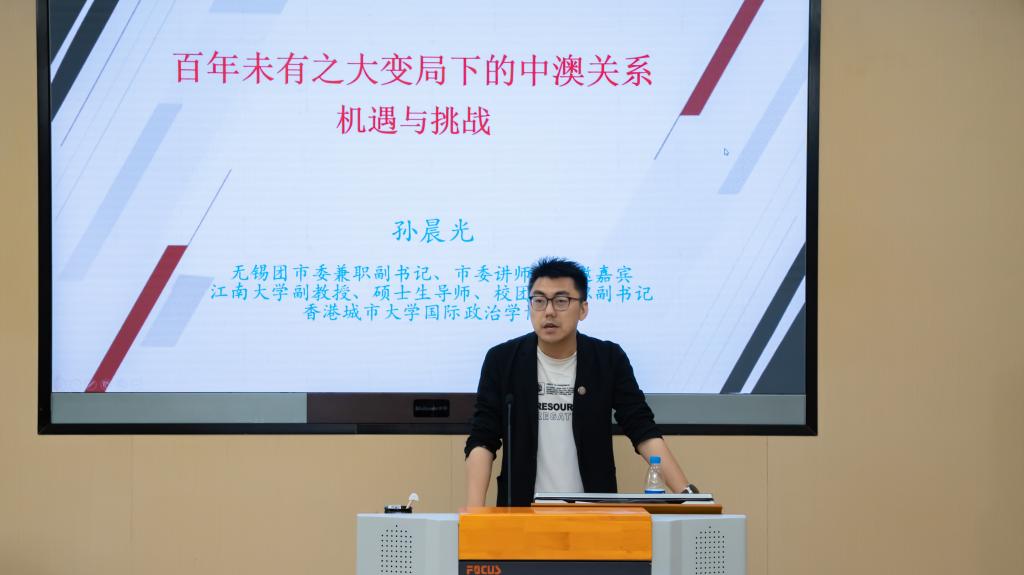 在国际形势主题讲座环节,AVxxx 马克思主义学院副教授孙晨光以“百年未有之大变局下的中澳关系”为主题作分享。他从历史脉络和现实挑战两个维度切入,深入剖析了当前国际形势对中澳关系的影响,勉励同学们在复杂多变的国际环境中,既要保持开放包容的心态,也要增强明辨是非的能力,做中外友好交流的桥梁。