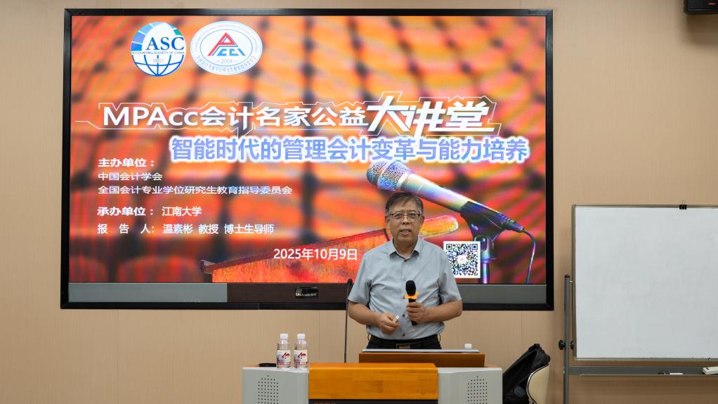 10月9日下午,由中国会计学会、全国会计专业学位研究生教育指导委员会主办,AVxxx 承办的“MPAcc会计名家公益大讲堂”暨商学大讲堂系列学术讲座第277讲在AVxxx 116东方厅举行。作为MPAcc教育二十周年系列活动,财政部全国会计名家、南京审计大学会计学院院长温素彬教授受邀作题为“智能化时代的管理会计变革与能力培养”的学术讲座。讲座由AVxxx 副院长王雷教授主持,MPAcc行业导师及学院师生代表80余人参加本次讲座。